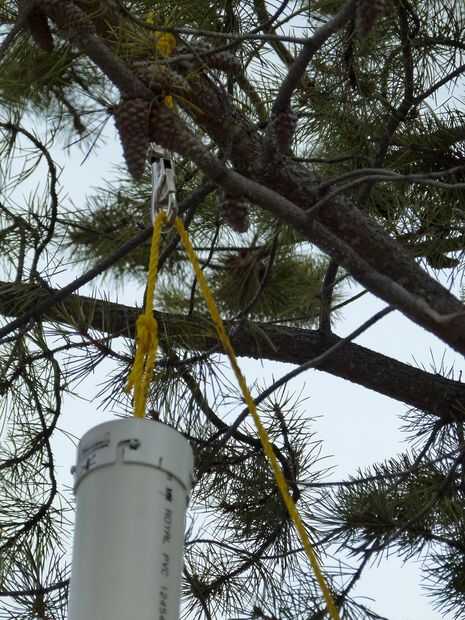 Tenía un aparato de cierre que yo atado al árbol, pero sólo podía atar un lazo de cuerda para el árbol. Ató la cuerda al tornillo del ojo en la tapa y rosca de la cuerda a través del lazo en la rama de árbol. Entonces pude Levante el alimentador del pájaro (completo de la alimentación, por supuesto) en el árbol y atar la cuerda en la parte inferior del árbol. Necesitaba utilizar una escalera para obtener ese primer bucle en su lugar, pero desde ese momento, puedo acceder a mi comedero de pájaros de la tierra.