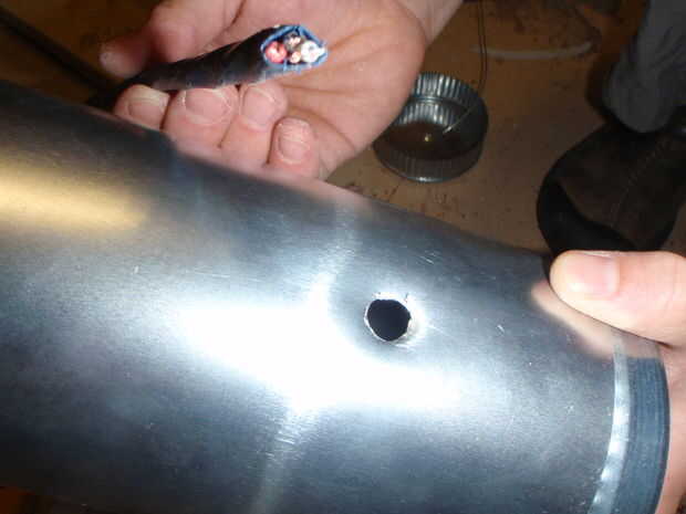 Apenas más grandes que el cable/clavija en lados opuestos de la tubería cerca de la parte inferior dos orificios.