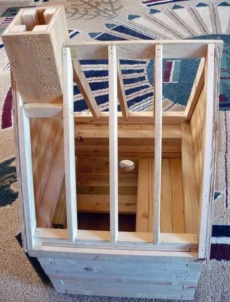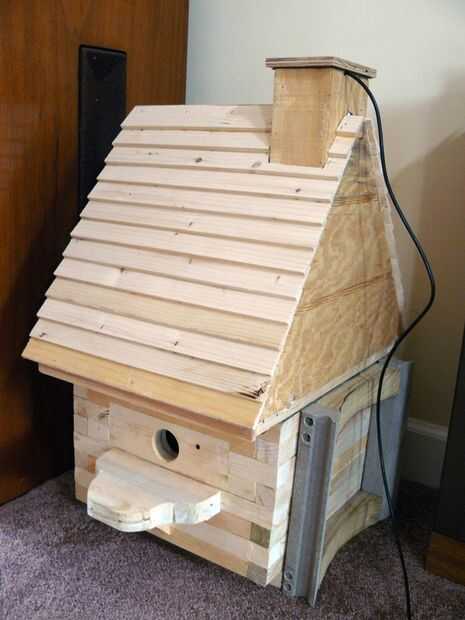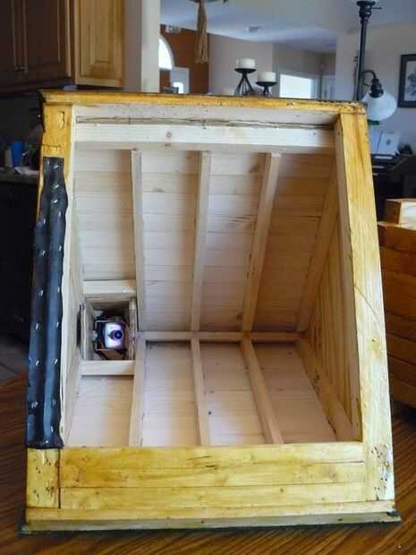 La chimenea es contrachapado de exterior y la ubicación de la leva del espía. Trajo el cable para la Cam de espía en debajo de la placa superior de la chimenea para que pudiera llegar a lo más fácil sin derribar la casa. Usé madera de la placa superior original. pero las ardillas grandes comenzaron a masticar para arriba inmediatamente, así que lo reemplacé con una placa de acero.