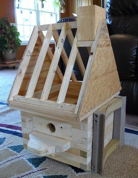 El material para techos se corta de la original de 2 x 4 y tener cerca un bisel de 15 grados para el traslapo, pero podría utilizar otro material para ahorrar tiempo y problemas. Sólo me gustó la forma de la cubierta de Junta de regazo se ve, pero si usted los USA Asegúrese de utilizar algún pegamento para madera a lo largo de los bordes entre listones para mantener fuera la lluvia. El pico de la azotea es una franja de tapajuntas doblado sobre y grapado y pegado para formar una abertura para el aire caliente en el verano.