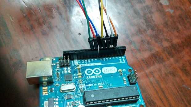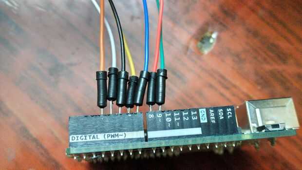 Conecte el teclado a través de pernos de teclado a los pines de arduino 3 a 9 (fila de pines a 3-6) (pernos de columna a 7-9). Puede verificar las conexiones viendo el código de colores de cables utilizados.