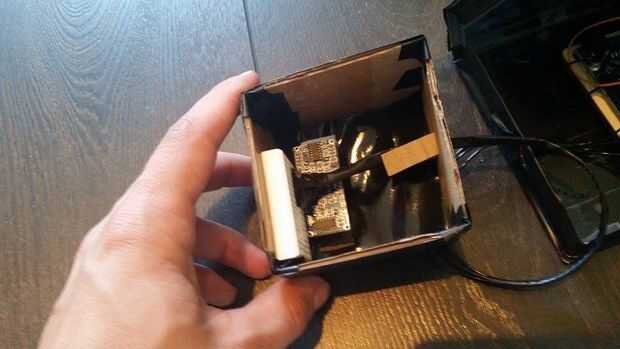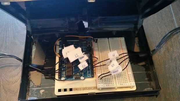 Más tarde se construyó en los sensores en una simple caja de cartón y pone el Arduino en un viejo caso VHS.