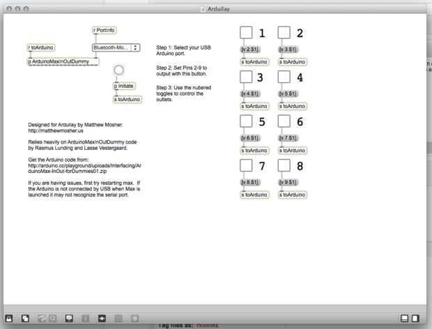 El código de Arduino viene de laArduinoMax_InOut_forDummies de la playground de Arduino. Sólo subir el sketch incluido desde allí.