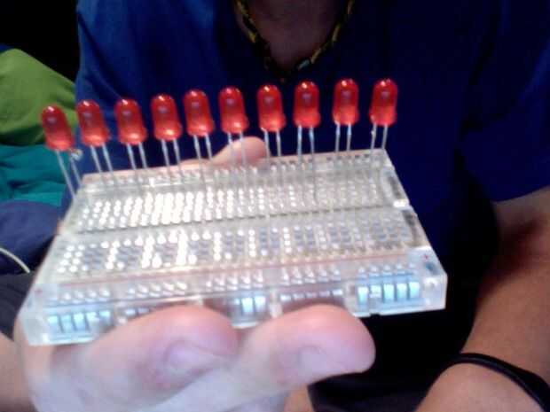 Tomar tus leds y ponerlos en una fila en el protoboard. Asegúrese de que saber qué lado del led es positivo y qué lado es negativo. Quisiera el lado positivo del led hacia la derecha. Además, tenga un un agujero espaciado entre cada led