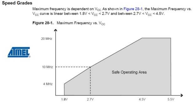 Problema: El Arduino estándar utiliza un cristal de 16MHz. Ahora si nos fijamos en la documentación, el AtMega328P operará desde 1.8 a 5.5Vdc. Sin embargo, la tabla de grados de velocidad muestra que el AtMega328P no puede trabajar con un cristal de 16MHz a 3.3Vdc. (Ver tabla)