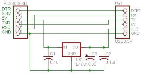 Así que decidí hacer un adaptador para mis módulos PL2303 para usar un 3.3Vdc regulador de voltaje conectado a los módulos 5Vdc. Utilicé un regulador de L4931C33 que puede suministrar 300 mA de corriente.