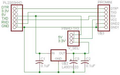 Mirando el esquema, se puede conectar un puente de dos pines para que el ProMini recibe 5Vdc en el pin Vcc o 3.3Vdc. O si no se utiliza el puente no habrá ningún voltaje en el pin Vcc de la ProMini.