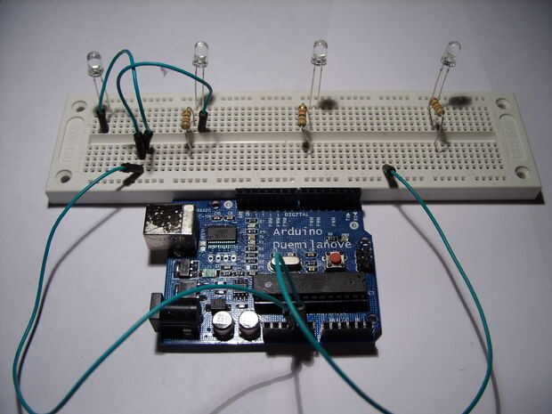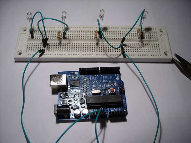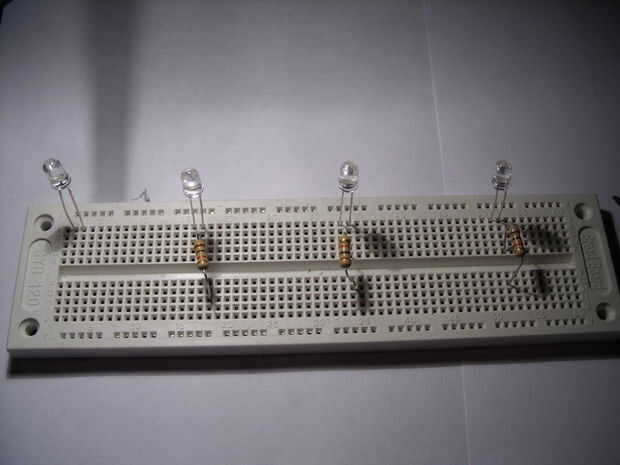 Primero la tierra, alambre 2 motivos para el protoboard como en la imagen. A continuación va a cada led, 4 más led y del 2 recinto cada plazo de ejecución corto.