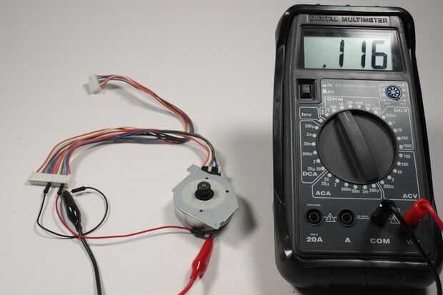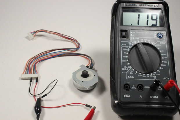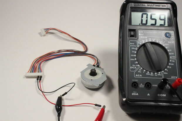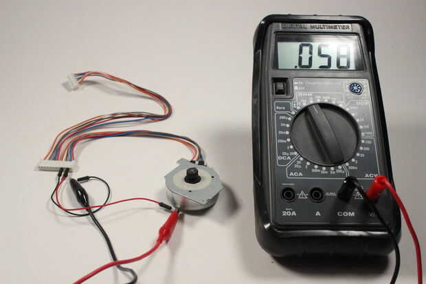 Más paso a paso motores vienen con cuatro, seis u ocho cables. Este motor utiliza cables de seis. Lo que tenemos que hacer es medir la resistencia de un cable de motor a otro. Esto es debido a la forma se hacen motores paso a paso, motores paso a paso tendrá dos bobinas y puesto que este motor tiene seis cables que significa hay 3 cables por bobina. Cada una de las dos bobinas que tienen un hilo común une al centro de la bobina, no queremos usar este cable. La manera en que podemos determinar que este alambre es suyo mediante la medición de la resistencia y la resistencia de uno de los cables del centro a uno de los otros cables en la bobina del mismo será más pequeña que los otros pares. Si dos cables no están en la misma bobina, mides un circuito abierto. Aquí son las resistencias que me mide