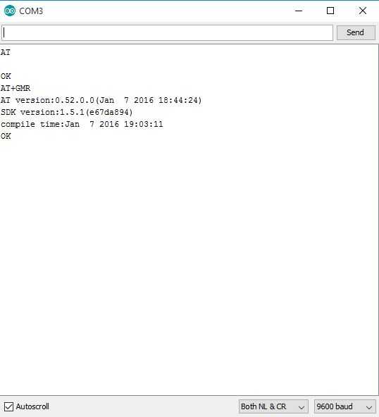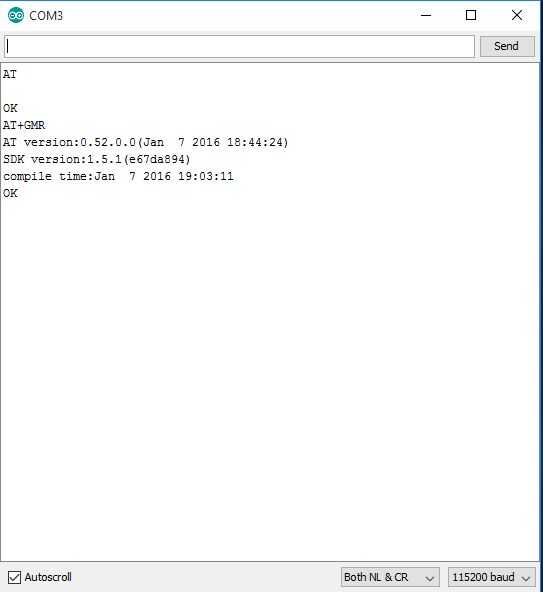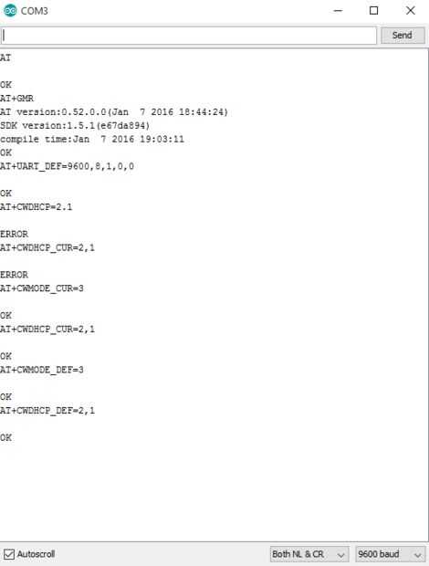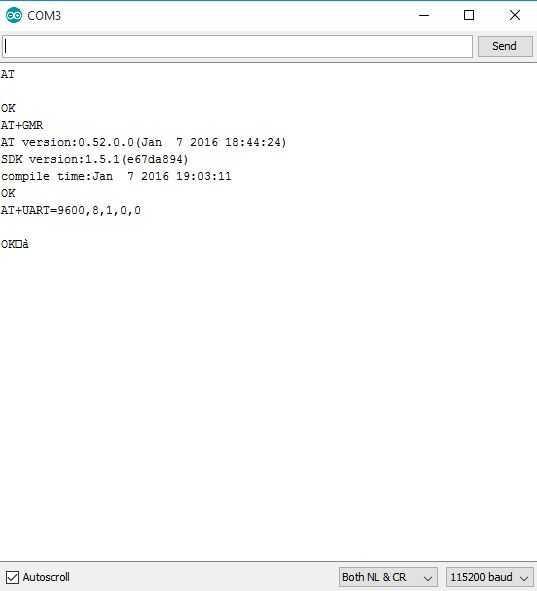 Ahora que hemos cargado el firmware, queremos probarlo y realizar algunos cambios en él. El recurso más grande para esto será el manual para el SDK, que puede ser obtenido desde el sitio web Expressif. Para este instructivo aunque queremos asegurarnos tenemos la versión correcta, configurar el softAP, activar DHCP y reducir la velocidad en baudios de 115200 a 9600. La razón de la reducción en la tasa de baudios es que necesitamos usar el serial del software en el Arduino para poder comunicarse con el Arduino y el ordenador. Para iniciar, asegurar que desconectado el cable USB de la computadora en el ultimo paso, mover el GPIO0 de GND a una porción no usada de la placa (o simplemente quitar el cable). Enchufe ahora el cable USB en e ir al IDE de Arduino. Ir a herramientas / tablas y seleccione ESP8266 genérico. Cambiar el puerto para que coincida con su puerto de comunicación detectado de la FTDI. Ahora abra al serial monitor y cambiar la velocidad en baudios a 115200. Ahora puede comenzar a usar comandos AT para hablar con el Arduino. El primer comando que desea ejecutar es AT. Esto debería devolver un OK y le deja que saber que está trabajando el conjunto de comandos AT. Ahora escribe en + GMR y presiona enter. Usted debe ver la versión del firmware volvió similar a la imagen que postee. Lo que se ha agregado para el conjunto de comandos AT es que para la mayoría de los artículos que se almacenan para flash, usted puede realizar una prueba del comando primero. Esto es bueno porque si establece un valor mal y hacer que la tarjeta no responde, un simple reinicio lo pondrá nuevamente a donde estabas. Permite establecer la velocidad en baudios de 9600, necesita hacerlo de todos modos y si sólo está usando esto para obtener su ficha de ESP listo para usar, este debe ser el último paso. Si miras el manual para el firmware, usted notará que para muchos de los comandos AT + CW, hay 3 versiones. Una versión depreciada, una versión _CUR y una versión _DEF. La versión _CUR siempre debe ejecutar y probada antes de ejecutar la versión _DEF como esto escribe el comando que flash y el nuevo valor predeterminado en el arranque de la viruta. Para cambiar la velocidad en baudios se escriba AT + UART_CUR = 9600, 8, 1, 0, 0 (Nota: el manual muestra 9600, 8,1,0,3 no lo hace se pierde comunicación con la Junta y tienen que volver a cargar una versión de firmware muy viejo para restaurar) y pulse Entrar. Se verá algo, puede ser legible, no puede. La razón de esto es que el chip ahora funciona a 9600 en vez de 115200 por lo que ahora necesita cambiar la velocidad a 9600 en el monitor serie. Hacerlo ahora sin desconectar el chip o cerrar la ventana. Se borrará la ventana y otra vez puede ejecutar los comandos AT y AT + GMR. Si esto tiene éxito, vuelva a ejecutar el comando UART como _DEF esta vez: AT + UART_DEF = 9600, 8, 1, 0, 0, debería ver un OK. El último comando que debemos ejecutar es activar el DHCP. Es raro pero esto va a necesitar a hecho de softAP y estación. Antes de esto lo podemos hacer pero necesitamos para asegurarse de que están en el modo correcto. Por simplicidad, set AT + CWMODE_CUR = 3 y, a continuación, AT + CWDHCP_CUR = 2, 1 te darás cuenta que los números son ligeramente diferentes según el modo 1 = estación, 2 = softap y 3 = ambos mientras que dhcp es 0 = estación, 1 = softap y 2 = ambos. La clave aquí es que todo lo que usted ajuste el modo a, necesita habilitar el dhcp para. Una vez que una autorización para ambas entradas, cometen a flash con AT + CWMODE_DEF = 3 y AT + CWDHCP_DEF = 2, 1. Ahora puede desconectar el ESP de la protoboard.