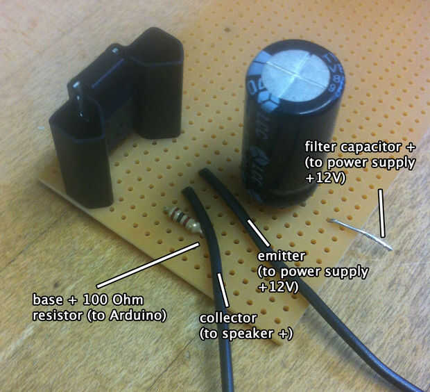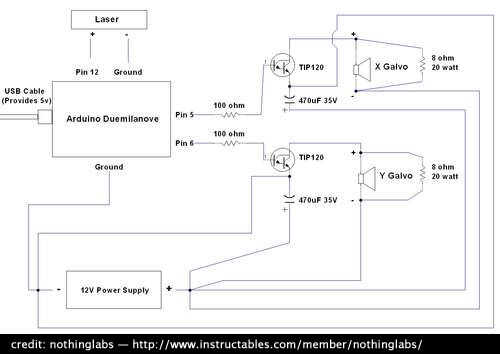 Los cuadros secundarios demuestran los componentes para la conducción de uno de los dos oradores: un transistor Darlington TIP120, un condensador de filtro que limpia la energía de su fuente de alimentación y un resistor de 100 ohmios para limitar la corriente dibuja del Arduino. Repita para el otro galvo.