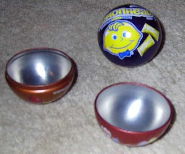 Solución: Una sugerencia fue huevos de Pascua plásticos. Otro fue cucharones de sopa metal. El plástico es frágil y se deteriora en calor. Cucharones de sopa sería difíciles trabajar con. Miré y pregunta alrededor. Mi primo vino para arriba con estas bolas de aluminio que tenía candy LemonHead\AtomicFireball en ellos. Son unos 2,7" en diámetro. Desafortunadamente, esto puede haber sido una cosa de la Navidad. Mi primo compró en un Rite Aid. Se hacen por ferrapan.com. Usted puede tiene que encontrar un sustituto.