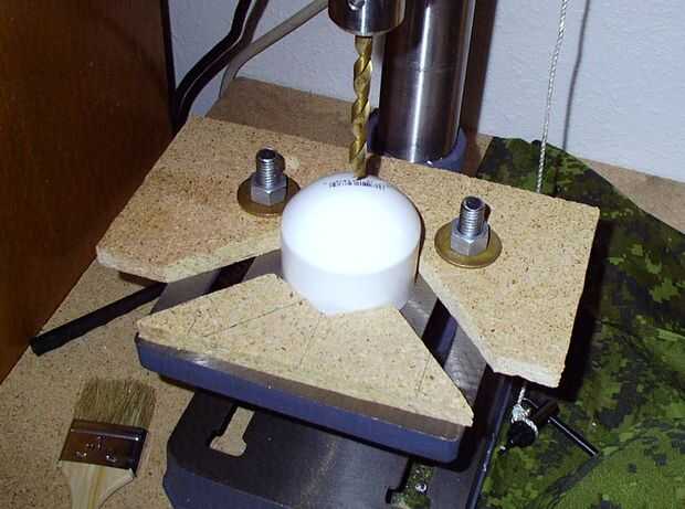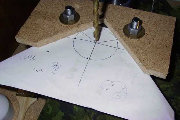 Encontrar el centro: Hice un pequeño soporte de V (ver imagen). Poner en una 5/16 broca ya que he utilizado 5-16 /bolts. Coloque la plantilla de papel debajo del soporte de V alineando el borde del círculo con los bordes del soporte V. Doblar o cortar para que se ajuste en los pernos. Ajuste el soporte de la V y la plantilla de modo que la punta del taladro sobre el centro de la circle(see picture) papel. Coloque la tapa en la V y marcado el 'centro' con un rotulador. Ahora si se gira la tapa, el centro debe permanecer directamente debajo de la broca. Seguir trasteando con el soporte y la marca hasta la extremidad del taladro permanece centrada. Pinza y taladro (véase el cuadro, las abrazaderas no se muestran). Supongo que los lectores más mecánicamente hábil tienen una mejor solución pero esto fue suficiente.