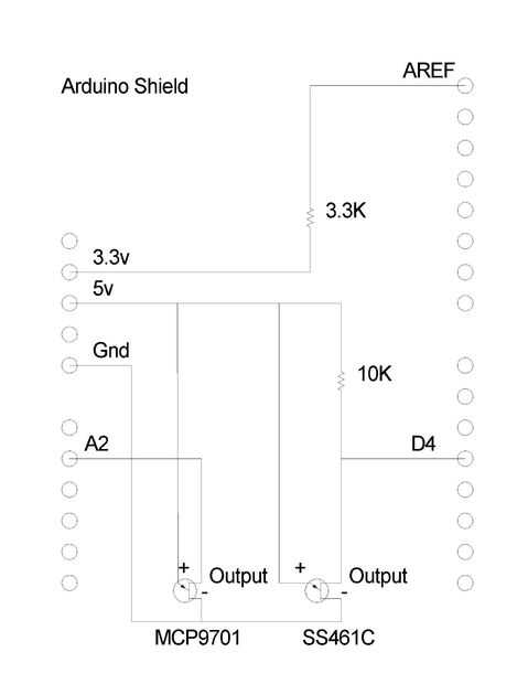 El cable rojo de los sensores deben llegar a + 5V en el escudo, el cable negro va a tierra. El cable verde de la salida de sensor de efecto hall de SS461C va a Digital 4. El cable amarillo desde la salida de sensor de temperatura de MCP9701 va a 2 análogo en el escudo de Arduino. En el escudo Conecte una resistencia de (10K las obras) de 5Vdc a Digital 4. También conectar una resistencia de 3.3K entre 3.3V y AREF (explicado más adelante).