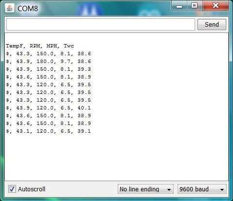 Ver qué es RPM en el terminal de la serie de Arduino. (El terminal de la serie también muestra MPH y Twc pero estos valores se basan en mi calibración de anemómetros). Tomar conocido MPH del coche y dividirlo por el número de revoluciones y enchúfelo en el código de Arduino. Aquí está el código de Arduino. Reemplazar.054 con su cálculo.