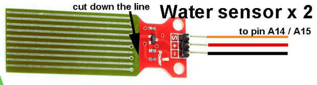 He utilizado dos módulos de sensor de agua. Usted encontrará que las tiras de metal en el módulo de nivel de agua están conectadas a dos diferentes puntos en el tablero del módulo principal. Cortar los sensores de la línea (véase el cuadro), y luego en los restantes dos contactos soldar algunos cables que conecté a algunas barras de plata (Ag), utilizadas como sensor de sondas. La razón para el uso de barras de plata es que quería reducir la oxidación de las barras debido a electrólisis - https://en.wikipedia.org/wiki/Electrolysis