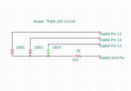 En este circuito estamos usando pernos 11,12 y 13 como salidas digitales (5V) para encender el LED. El poste negativo de cada LED se conecta a través de una única resistencia compartida y luego a tierra. En mi circuito utilizo una resistencia de 150 ohmios (era sólo un conveniente gancho agarrador de mi papelera de piezas). Se pueden utilizar otros valores aquí--no ir demasiado extremas para que no sea (a) mantener el LED de iluminación o (b) empuje demasiado actual a través de su Arduino.