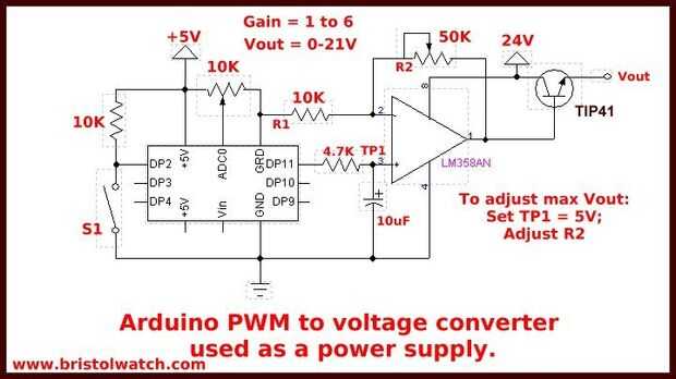 En la figura 3 tomar el mismo circuito en la figura 2 pero usar un LM358 solo como un amplificador del voltaje, impulsar Vcc a 24 voltios y cambiar el 10K a 50K dar una ganancia de 1 a 6 También hemos añadido un transistor de potencia TIP41 NPN para impulsar la corriente de salida. Ajustar el pot de 10K en ADC0 para 5 voltios en TP1 primero ajustar R2 para un voltaje máximo de salida entre 5 y 20 voltios. Si bien esto muestra un Arduino NANO que funciona con cualquier Arduino.