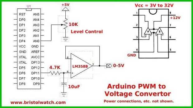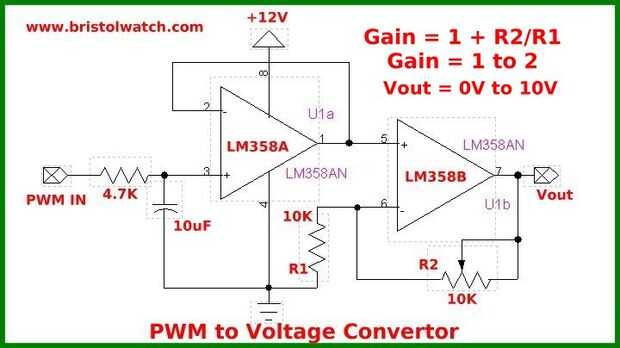 Ver Figura 2 con la otra mitad del LM358 como un amplificador de voltaje cuya ganancia se basa en 1 + R2/R1. Con el 10K potenciómetro conectado entre el pin de salida 7 y alimentado a la entrada invertida que podemos ajustar para una ganancia de 1 a 2. La salida con una fuente de 12 voltios es 0-10V o 2 voltios por debajo de Vcc.