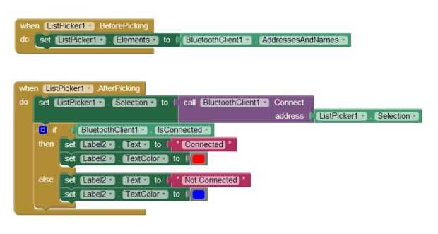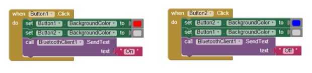 Después de terminar el botón de diseño haga clic en "bloquear" de interfaz de usuario en la esquina superior derecha, es hora de programación. ¿Espera, programación, no es que algo maldita a gente que casi conduce loco? Pero aquí programa arrastrando todos los bloques, al igual que juego de puzzles que jugó en su niñez. Agrego dos elementos llamados ListPicker y BluetoothClient, como se puede ver arrastrar el bloque "cuando ListPicker1. BeforePicking"&" cuando ListPicker1. AfterPicking"y colocar nombres y direcciones de BluetoothClient1 como sus elementos, que significa que al hacer clic en el botón ListPicker1, se le mostrará una lista de nombres y direcciones de BluetoothClient1. Después de seleccionar un Bluetooth establecerá el texto como "Conectado", de lo contrario es "No conectado". A continuación lo que tienes que hacer es arrastre dos botones, uno que toque se convertirá en su lámpara de mesa, el otro está apagado. Como se puede ver la tercera foto en esta sección, al hacer clic en uno, que cambia su color a rojo y enviar mensajes de texto, usar "En" aquí, para BluetoothClient1, decirle que encienda la lámpara; al hacer clic en botón dos, cambiará su color a azul, enviando un mensaje de texto, usar "De" aquí, a BluetoothClient1, a es el momento de apagar la lámpara.