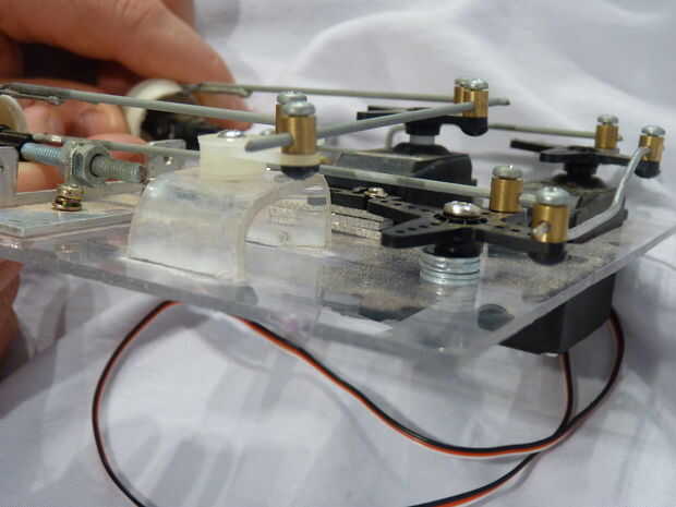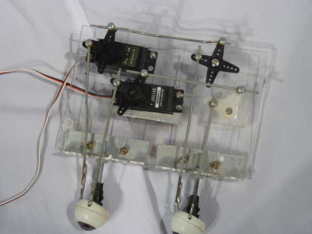 Montaje de los servos, servo #2 debe calzar de manera superior. Esto es por dos razones 1) para mantener el cuerno del servo con la parte superior del globo ocular y 2) para evitar interferir con las barras de control # 1 de servo.