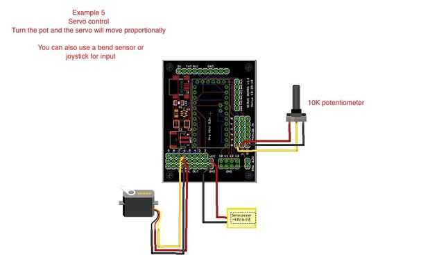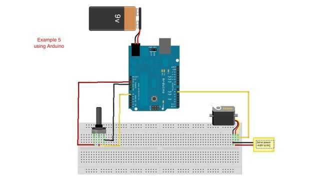 Estos dos ejemplos muestran lo fácil que es controlar servos utilizando una entrada analógica. Usted puede utilizar cualquier dispositivo de entrada analógica que desee-usaré el potenciómetro 10 k ohmios para el esquema de ejemplo. Como puede girar el bote (y cambiar su valor) el servo se mueve proporcionalmente.