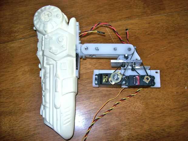 El mecanismo de cañón del prototipo fue construido utilizando trozos de plástico Delrin y correas y engranajes de impresoras de escritorio viejo y fotocopiadoras que he encontrado en la basura. Cuando construyo la versión final para el traje de depredador probablemente será enteramente engranes para que sea más compacto y limpiador.
