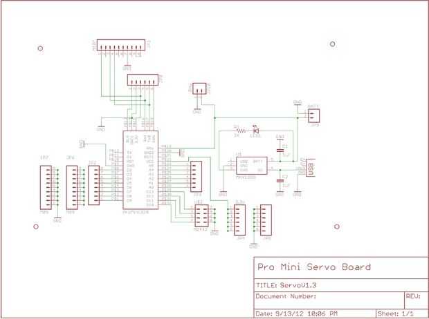 Ya que mi enfoque es principalmente en el edificio del vestuario decidí utilizar el Sparkfun Arduino Pro Mini y luego construir una tabla de aplicaciones de servo compacto para lo que tiene múltiples salidas de servo, entradas analógicas y salidas digitales. También he añadido un zócalo para un adaptador de radio inalámbrica Adafruit Xbee, así como un circuito de carga para una sola celda LiPo batería para alimentar el controlador.