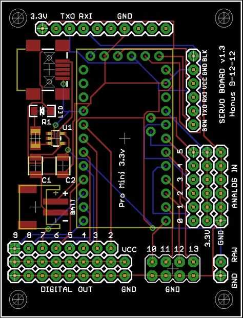 El última versión servo tablero tiene seis entradas analógicas, 4 salidas digitales y ocho salidas de servo. Las salidas de servo también son salidas digitales-que sólo están configurados para que sea realmente fácil para conectar los servos de hobby. La versión anterior que se ve en las fotos tiene seis salidas de servo. Cada salida de servo tiene tres pernos de tierra, alimentación y señal. Las entradas analógicas se configuran del mismo modo, cada entrada tiene tres pernos de tierra, alimentación y señal. Esta configuración es muy fácil de conectar sensores individuales. El tablero mide 1,75 "x 2,30" así que es bastante pequeña.