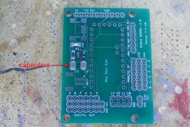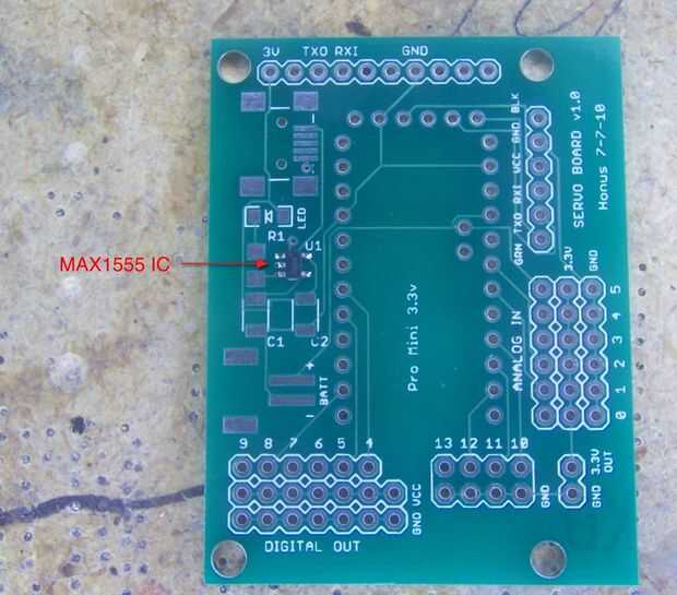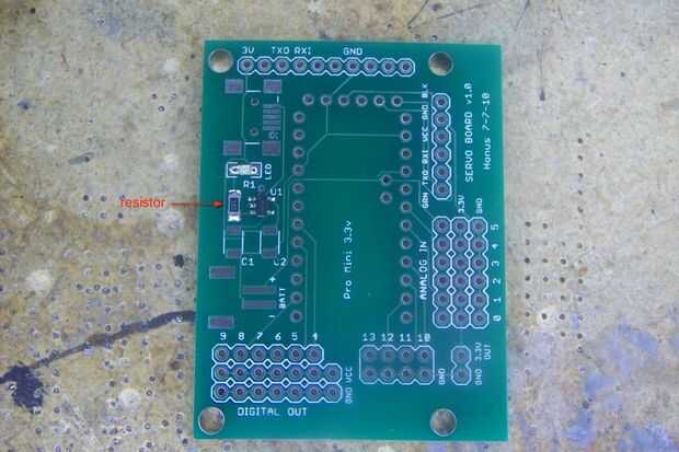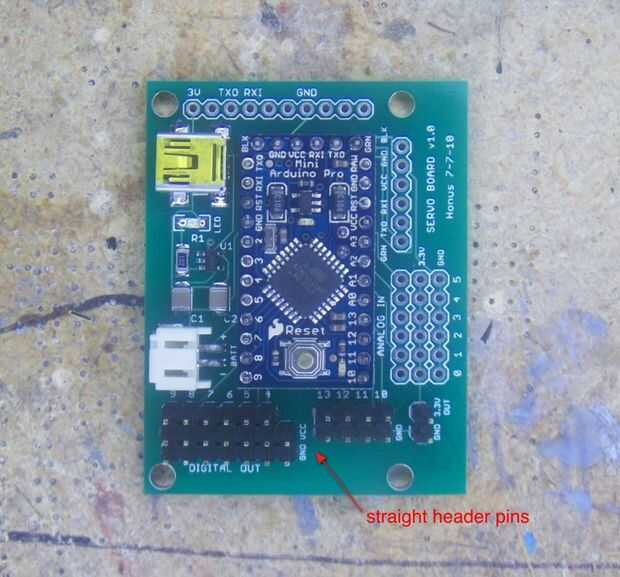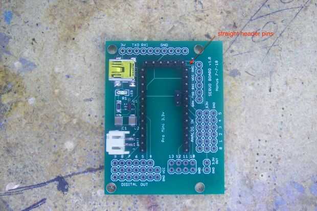 Ahora la soldadura en los pernos en el tablero del Mini Pro. Esto se hace por soldadura en los pernos de cabecera recta lejos de rotura. Primero inserte los extremos del pasador largo en el PCB, voltee la placa y soldarlos en el lugar. Verifique sus empalmes de la soldadura. Ahora voltea el tablero y colocar el tablero del Mini Pro en la parte superior de los pernos expuestos y soldar todos los pines en su lugar. A continuación soldar los restantes pines rectos en su lugar en el digital posiciones y los 3.3v puerto a lo largo de la parte inferior del tablero.