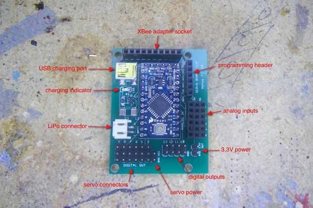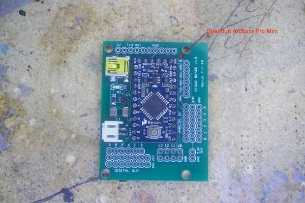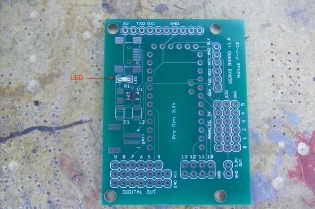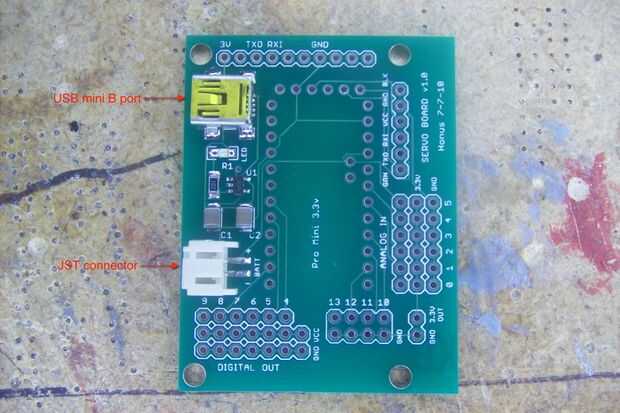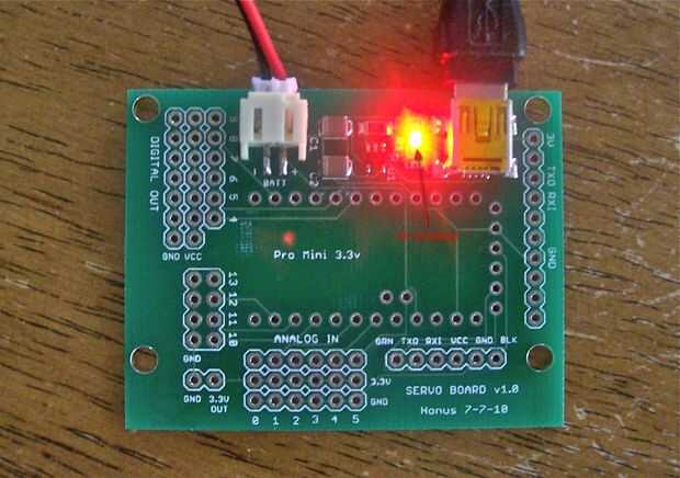 Asegúrese de que la placa está recibiendo energía conectando un cable USB en el mini puerto USB de la tarjeta controladora. Deberá encenderse el LED rojo en el Arduino Pro Mini.