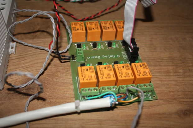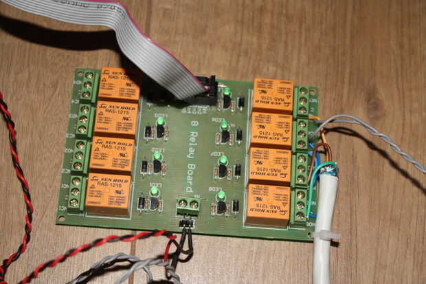 "Lo controla" de un relé es accionado por un transistor conectado a los pines del microcontrolador. Conecté mis pines de arduino (tierra + 3 pernos) al conector de entrada de la Junta que a su vez me conecta con dicho transistores.