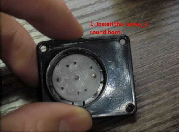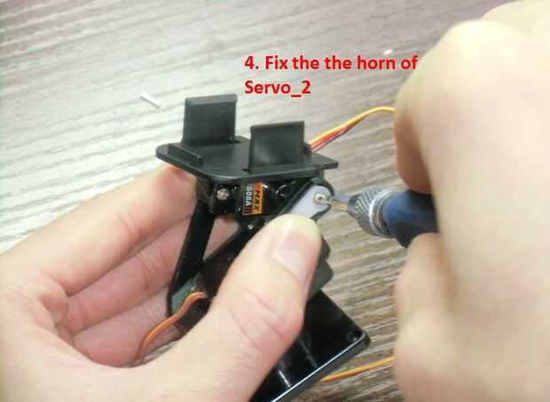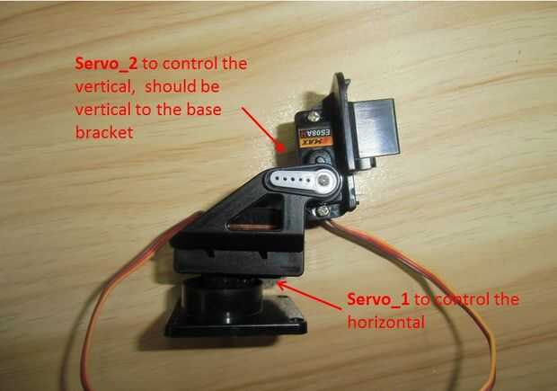 Cuando instale el servo y el soporte, con el fin de localizar la ubicación de la olla, usted necesita a la posición de ajuste del "cero". Primero instalar el programa MedianValueSetting a su Crowduino y hacerlo correr. Y luego instalar el servo_1 (el servo para controlar la posición horizontal) a la misma dirección de la base y el servo_2 (el servo para controlar la posición vertical) vertical a la base del soporte que la imagen.