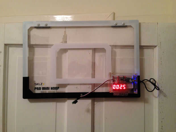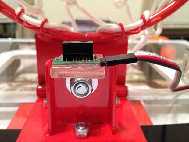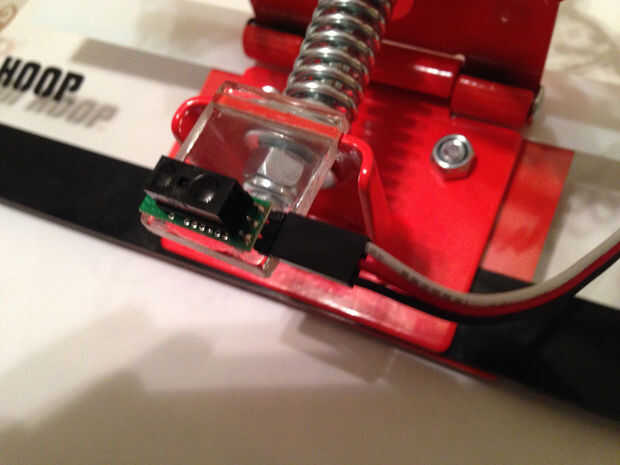 Tomamos un pequeño trozo de acrílico y poner un surco en ella con la Sierra de mesa, que entonces era super pegada a la llanta. Otro pedazo de cinta adhesiva Loctite fue utilizado en la parte posterior del sensor de distancia para garantizar que la nueva ficha. Es importante para asegurarse de que el sensor se sentó lo suficiente para ver aunque un agujero en la red, en contra de directamente a la cuerda.