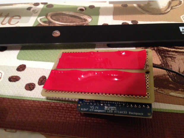 Cinta doble cara de Loctite se utilizó en la parte posterior de la Junta de proto para garantizar al tablero. El caso de acrílico se puso encima y los agujeros fueron perforados con un taladro para permitir la conexión con tornillos por detrás del tablero.