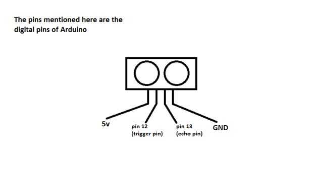 El sensor ultrasónico tiene cuatro pines en el que el primero de la izquierda es para ser conectado a 5v, la segunda y la tercera es el gatillo y el pin eco que está conectado al Arduino y el cuarto pin está conectado a la tierra. La configuración se muestra en el diagrama anterior.
