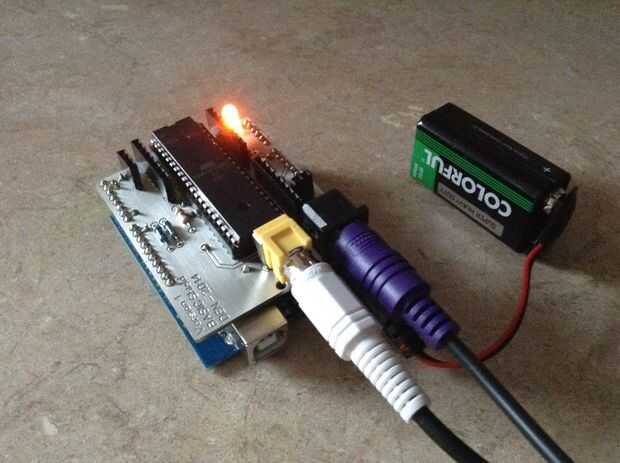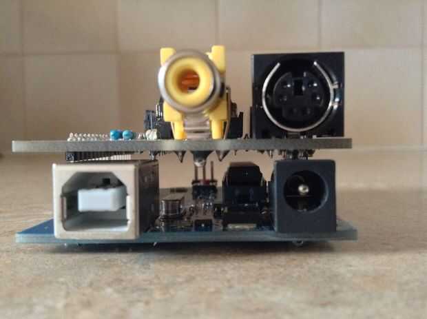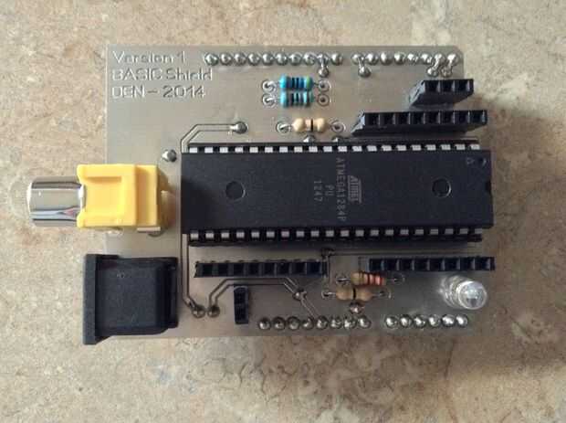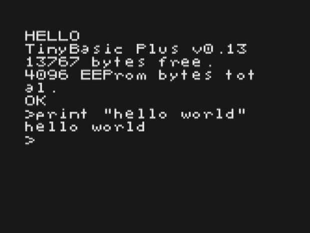 Al conectar una TV y un teclado PS/2 con el escudo (como una conexión de alimentación), me encontré con los mensajes de puesta en marcha de TinyBASIC que indican la cantidad de memoria disponible y la versión del software mostrando todo funcionaba OK. Las imágenes muestran la configuración con TinyBASIC visualizada en el TV conectado y el PCB completamente montado.