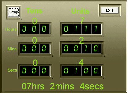 Lo que necesitaba era mostrar el binario 1s y 0s en displays de 7 segmentos. En el momento era demasiado difícil y demasiado caro para tener en cuenta por lo que a finales de los noventa aprender Visual Basic construyó una versión de software "Reloj binario de Windows" como una prueba de concepto. Esto se muestra en la imagen 3.