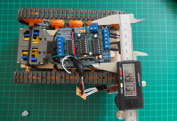 Primero medí el tamaño de tarjeta que necesito levantar el Arduino por encima de las pistas del tanque, luego recórtalo y había asegurado con cinta aislante. Esto se puede ver en las imágenes de arriba.