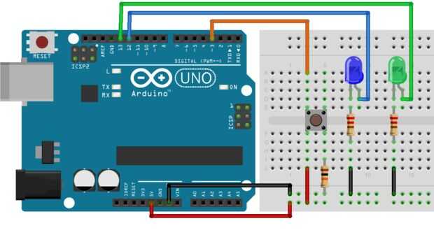 El botón está conectado a la salida de 5V y el pin 3 en el Arduino, luego a tierra con una resistencia de 10kOhm.