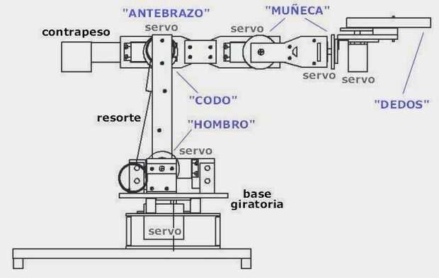 dos servomotores en la "muñeca", uno para mover arriba y abajo y uno para la rotación izquierda y derecha.