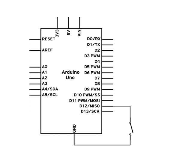 Simplemente conectar el Arduino GND a un terminal en el botón y conecte un pin digital para el botón terminal. En este ejemplo hemos utilizado el pin 12. Verificar el esquema y aplicación de "breadboard".