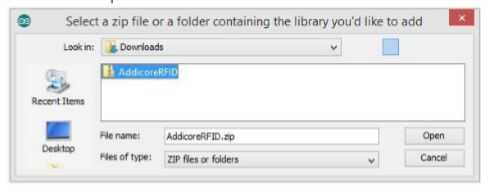 3. una ventana se abrirá. Desplácese hasta la ubicación donde se encuentra actualmente la biblioteca de AddicoreRFID que ha descargado anteriormente y ábralo. (Después de instalar la biblioteca de la parte inferior izquierda del IDE debe decir "biblioteca agregaron a sus colecciones. Compruebe el menú de 'Incluyen la biblioteca' "