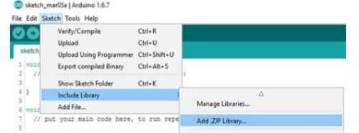 2. Abra el IDE de Arduino y desplácese al Sketch > Biblioteca incluyen. Aparecerá un menú desplegable. Haga clic en la opción de "agregar. Biblioteca ZIP..."