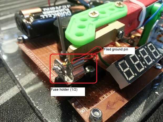 La primera pieza es construir el interruptor de eje de balancín. Este interruptor debe cerrar una de las dos conexiones, pero nunca ambos. También deben ser capaces de equilibrar en el medio donde cierra ni conexión. Esto detiene el reloj. Aquí utilicé una longitud pequeña de madera y se atornilla un conector de tierra de UK a cualquiera de los extremos. Entonces se construye un pivote en el medio para elevar el eje de balancín del tablero. Otra vez usé mi meccano ebay extensivamente para este bit. Cuando el eje de balancín está montado en el tablero las clavijas de tierra deban ir en las pinzas fusible para cerrar la conexión. Para hacer esto tiene una sensación suave presentar hacia abajo los bordes de las clavijas de tierra para ir en el portafusibles fácilmente (ver imagen).