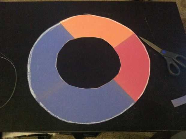 Empezar por grabar 4 pedazos de papel de construcción juntos. Hacer una segunda capa de la misma manera. Dibuja un círculo de 20 pulgadas en el papel de construcción. Esta es la frontera del borde exterior. Ahora en el centro de ese círculo, dibuje un círculo de 12 pulgadas. Se trata de la parte interior del sombrero. Corte el "donut".