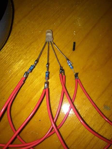 Los pines verdes y azules deben todos tienen una resistencia de 330 ohm soldada a él. Cada perno rojo debe tiene una resistencia de 360 ohm soldada a finalizó y la soldadura de los cables de las resistencias. Ejecute cada cable respectivo para el siguiente LED con resistencias soldadas en las clavijas. Continúe este proceso hasta haber soldado todos los 10 LEDs juntos.
