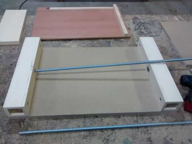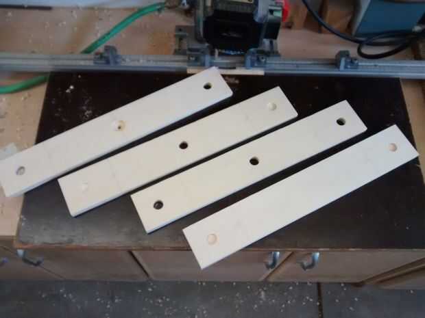 Para construir la base hemos cortados varias tablas de madera que han hecho agujeros y agujeros ciegos. Estas tablas forman el soporte de la máquina. Las varillas de acero atornilladas opera como una impulsión del gusano. Los agujeros ciegos sirven como tope para el acero de barras que actúan como guías para el eje x, en el centro, ponemos el acero atornillado, que cuando gira, genera el desplazamiento en el eje x. Anteriormente, hemos puesto un tablero de madera mayor peso y espesor para la estabilidad.