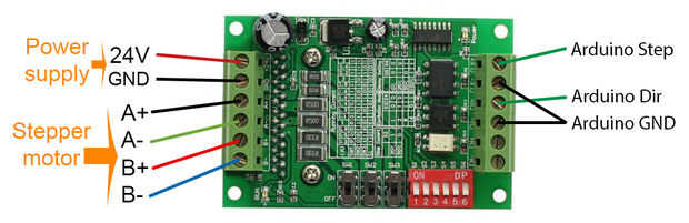 La connectiosn son simples. Usted necesita utilizar un driver para cada motor. Cada conductor necesita alimentación para trabajar. Usar una fuente de alimentación 24V 15A. Seleccionar en los controladores de mi amperaje de motores. El A +, A-, B +, B - corresponden con cada uno de dos bobinas de los motores y sus polos. CLK + (reloj) se conecta con el pin de paso en Arduino, CW + (Clock Wise) se conecta al pin de dirección, CLK y CW se conecta al pin GND. EN + y EN-no tienen que conectar.