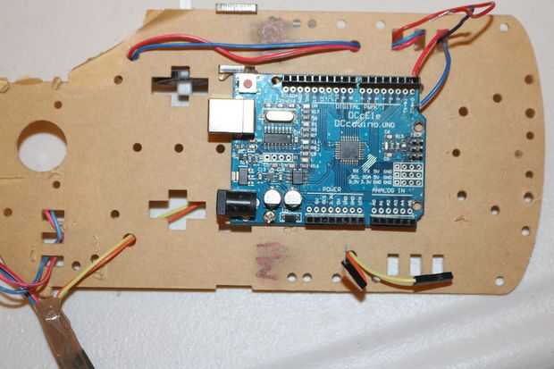 En tercer lugar la Arduino Uno en la plataforma de robot de montaje y coloque el escudo del motor en el Arduino Uno.